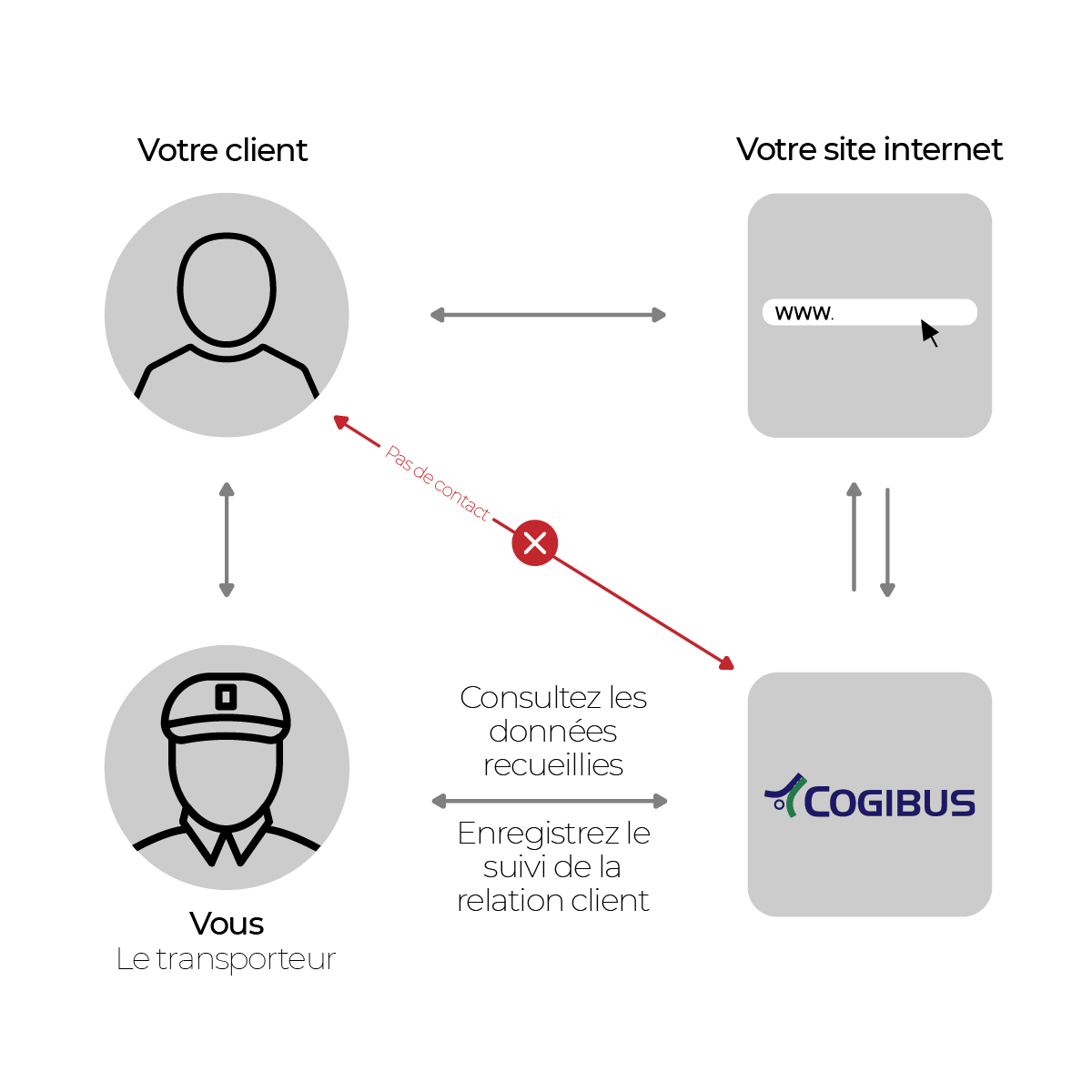 Client privéUn client privé ne fait appel qu’à une seule compagnie qu’il connaît ou qu’il sélectionné préalablement. Il enregistre sa demande via l’API intégrée au site web de cette compagnie. Cogibus n’entre pas en contact avec le client privé, sauf si sa demande est mutualisée.