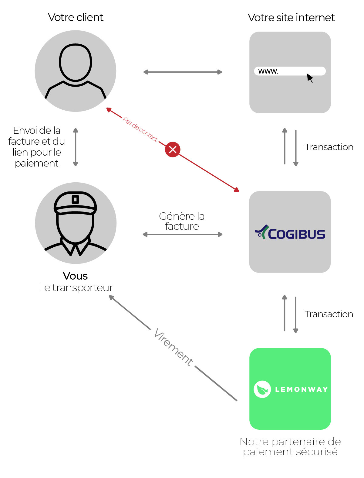 En cliquant sur le lien, il est alors redirigé vers Lemonway qui effectue le paiement et crédite votre compte. Une fois le paiement effectué, Cogibus inscrit la facture comme payée.