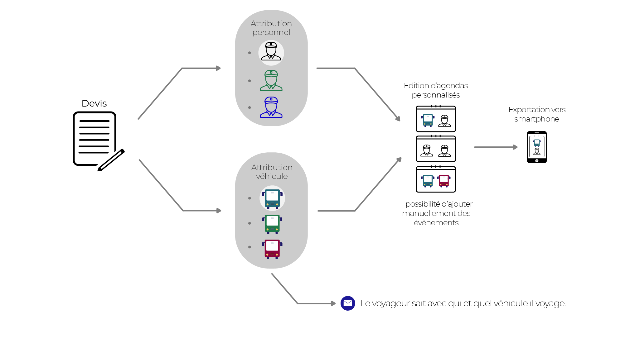 Ainsi, les différents membres du personnels peuvent consulter ces informations sur leur compte Cogibus et savoir quels sont ses trajets à effectuer et avec quel véhicule. De plus, les caractéristiques du véhicule assigné et les coordonnées du ou des chauffeurs sont automatiquement mis à la disposition des voyageurs concernés.